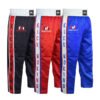 Kick Boxing Trouse made of 100% polyester satin with elastic and draw sting waist band with stripes on the left leg.